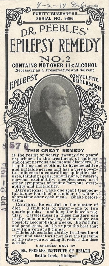 "The chemical breakdown of Dr Peeples’ Epilepsy Remedy was 8.4% alcohol and roughly 22% ammonia, potassium, sodium, bromide, and chloride. As the AMA noted, “The use of bromid[e]s in the treatment of epilepsy has been known for years” but was, at best, palliative—a far cry from Peebles’ claim that the compound offered a cure. The drug acted as a sedative, generally tending to suppress some seizures. Despite this effect, the AMA did not recommend Dr Peebles’ Epilepsy Remedy to epileptics because the “indiscriminate use” of bromides was dangerous. Early studies had found that long-term use of bromides caused irritability, depression, hallucinations, and homicidal tendencies."